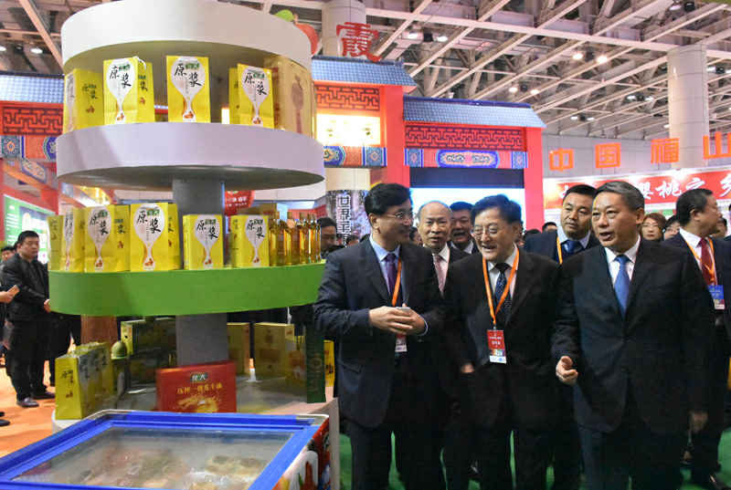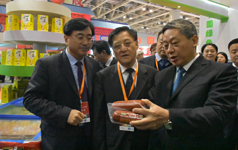 煙臺市委書記張術(shù)平(右一)向客商介紹龍大產(chǎn)品