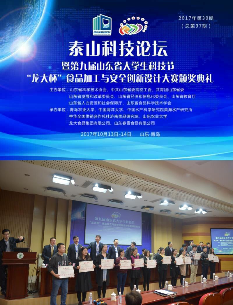 10月14日,泰山科技論壇暨第九屆山東省大學(xué)生科技節(jié)“龍大杯”食品加工與安全創(chuàng)新設(shè)計(jì)大賽頒獎(jiǎng)典禮在青島農(nóng)業(yè)大學(xué)舉行。龍大食品集團(tuán)有限公司參與承辦此次活動(dòng),旨在激勵(lì)大學(xué)生的創(chuàng)新創(chuàng)業(yè)意識(shí),發(fā)掘、培養(yǎng)應(yīng)用型人才,并為他們提供創(chuàng)新創(chuàng)業(yè)平臺(tái)。
